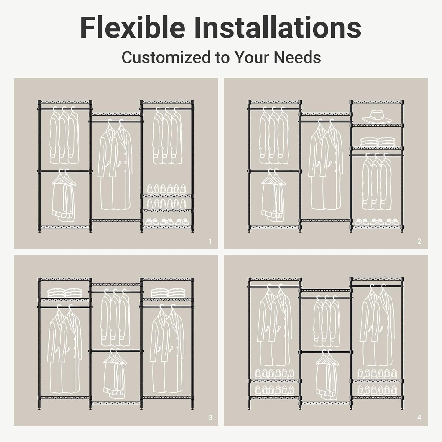 With 4 reinforced hanging rods and 8 adjustable wire shelves, it easily holds coats, suits, long dresses, shoes, bedding, and accessories — making it ideal for bedrooms, walk-in closets, retail stores, laundry rooms, and more.